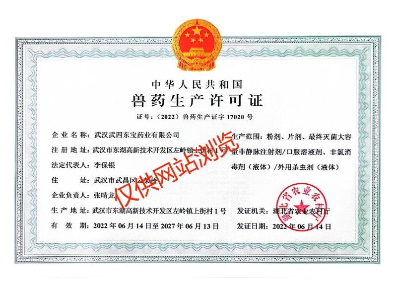 武漢武四東寶藥業(yè)有限公司,是在原武昌獸藥廠(成立于1972年)基礎(chǔ)上發(fā)展而來,公司位于武漢市東湖新技術(shù)開發(fā)區(qū)左嶺工業(yè)園,是一家專業(yè)從事動物保健品的研發(fā)、生產(chǎn)、銷售和服務(wù)于一體的高新技術(shù)企業(yè),目前擁有六條生產(chǎn)線、十種劑型(最終滅菌小容量注射劑、最終滅菌大容量非靜脈注射劑、口服溶液劑、粉劑、預(yù)混劑、固體殺蟲劑、液體殺蟲劑、片劑、顆粒劑、液體消毒劑)。公司成立于2004年,2006年全面通過國家農(nóng)業(yè)部獸藥GMP認證,已成為中國獸用保健行業(yè)知名企業(yè)之一。武漢武四東寶藥業(yè)有限公司自創(chuàng)建以來,一直秉承著“善、行、學(xué)、成”的核心價值觀,恪守“一切為了健康養(yǎng)殖”的企業(yè)使命,堅持“科技成就價值,服務(wù)創(chuàng)造未來”的服務(wù)理念,經(jīng)過多年不斷的創(chuàng)新與發(fā)展,逐步形成了自己的核心競爭力,并在行業(yè)中脫穎而出。公司與中國農(nóng)業(yè)大學(xué)、華中農(nóng)業(yè)大學(xué)、武漢工程大學(xué)、武漢工業(yè)學(xué)院、中科院水生所等全國知名院校和科研院所建立了長期密切的合作關(guān)系,通過聯(lián)合攻關(guān)和技術(shù)引進等方式,研發(fā)出50多種優(yōu)質(zhì)、高效、穩(wěn)定的產(chǎn)品,并深得廣大用戶的認可與信賴。公司以“追求健康的用戶群體和卓越市場占有率”為經(jīng)營理念,堅持以市場為導(dǎo)向,強化科技創(chuàng)新,拓展產(chǎn)品結(jié)構(gòu),努力為我國健康養(yǎng)殖事業(yè)的發(fā)展作出更大的貢獻!